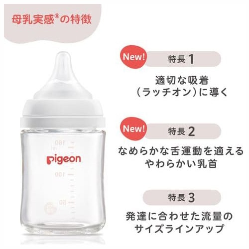 母乳実感の特徴 1.適切な吸着(ラッチオン)に導く 2.なめらかな舌運動を適えるやわらかい乳首 3.発達に合わせた流量のサイズラインアップ。 1ヵ月頃からの赤ちゃんにぴったりの、Sサイズ(丸穴)。
