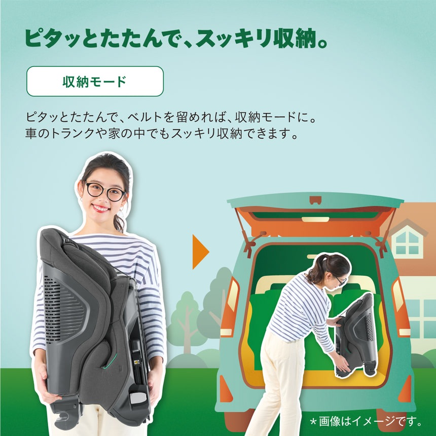 バックルを外すと腰ベルトが左右に広がる「ひらっくベルト」を採用、乗せ降ろしがますますラクになる機能です。