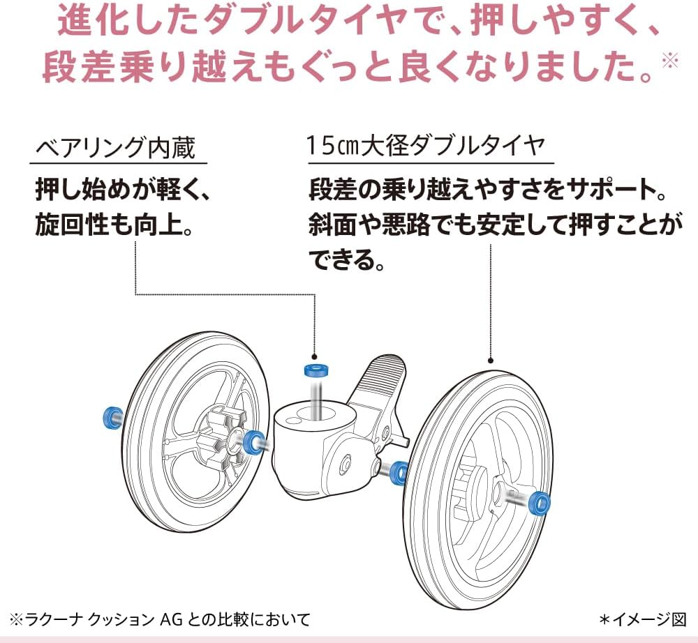 走行が安定する15cmの大径タイヤと、車軸を安定させ回転摩擦抵抗を少なくするベアリング内蔵。