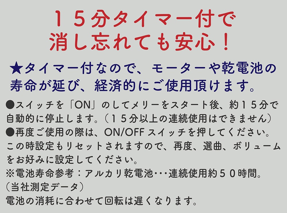 ■オートオフタイマー付き:メリーは15分で自動停止します。モーターや電池が長持ちで経済的です。