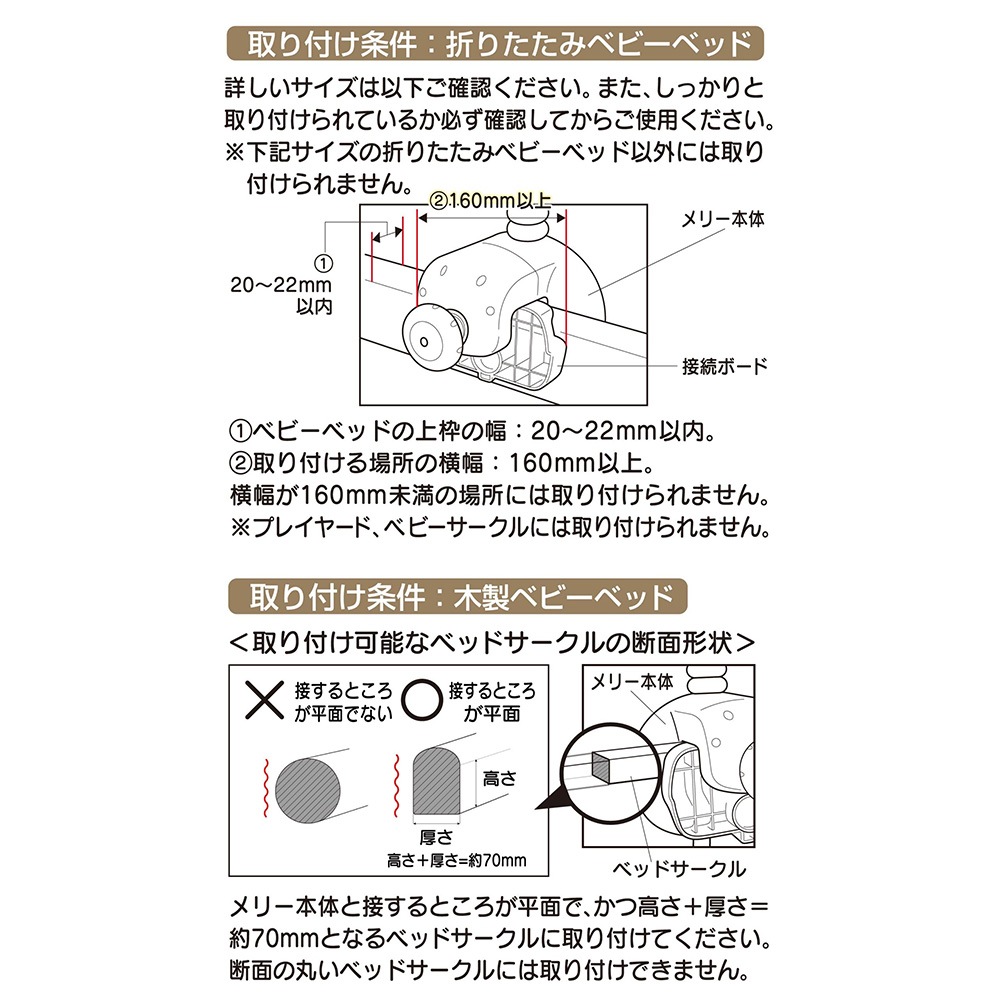 ○木製ベビーベッド 【メリー本体と接するところが平面で、かつ高さ+厚さ=約70mmとなるベッドサークルに取り付けてください。断面の丸いベッドサークルには取り付けできません。】