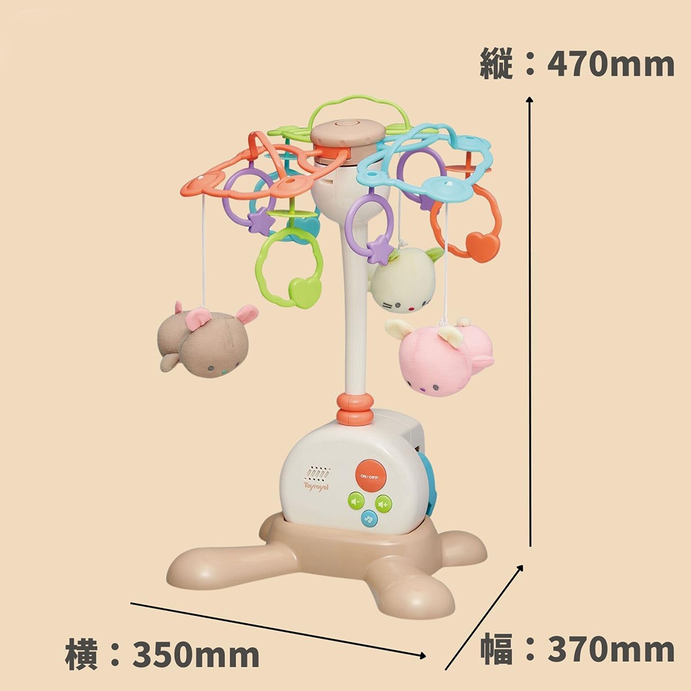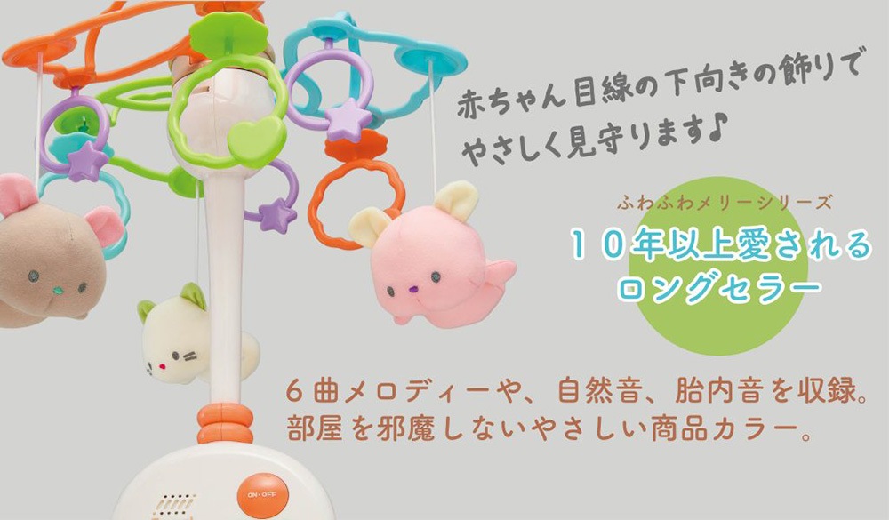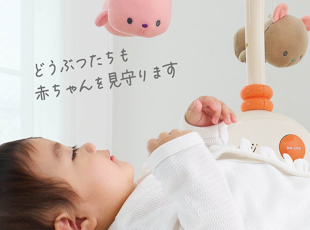 赤ちゃん目線でクルクル回るかわいいぬいぐるみたち、オルゴール音のメロディや自然音・胎内音を収録した、癒しのメリーです。