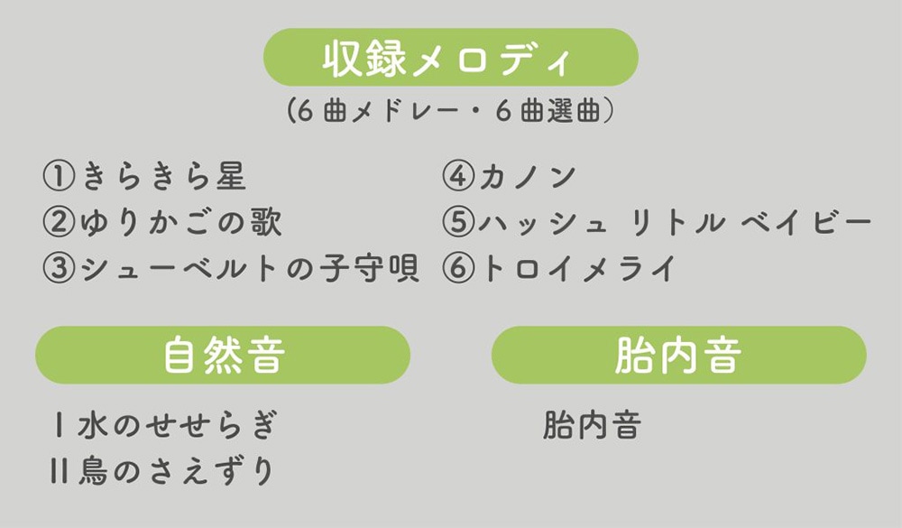 【①きらきら星/②ゆりかごの歌/③シューベルトの子守唄/④カノン/⑤ハッシュ リトル ベイビー/⑥トロイメライ】